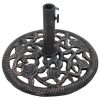The supplied adapter is suitable for umbrella poles with diameter of 1.4", 1.5" or 1.9". The detailed scrollwork and charming floral pattern will add a classy accent to any garden or outdoor space.Color: BronzeMaterial: Cast ironDimensions: 18.9" x 13" (Diameter x H)Weight: 26.5 lbsTube diameter: 2.1"Plastic tube inner diameter: 1.4"Support ring inner diameter: 1.6"With an adapter for umbrella poles with a diameter of 1.4"/1.5"/1.9"California Proposition 65
